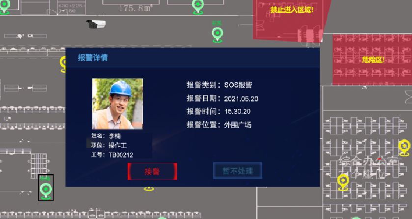 工人配備UWB標(biāo)簽,在發(fā)生安全事故(在發(fā)生坍塌、墜落、物體打擊、觸電等)、突發(fā)疾病、發(fā)現(xiàn)設(shè)備故障等緊急情況,在人員有意識(shí)的條件下,按下報(bào)警按鈕,可一鍵發(fā)出SOS呼救報(bào)警。遇險(xiǎn)人員的精確位置信息實(shí)時(shí)傳輸至告警平臺(tái),平臺(tái)在第一時(shí)間告知值班人員處理,最大限度地爭(zhēng)取救援時(shí)間,將損失降至最低。