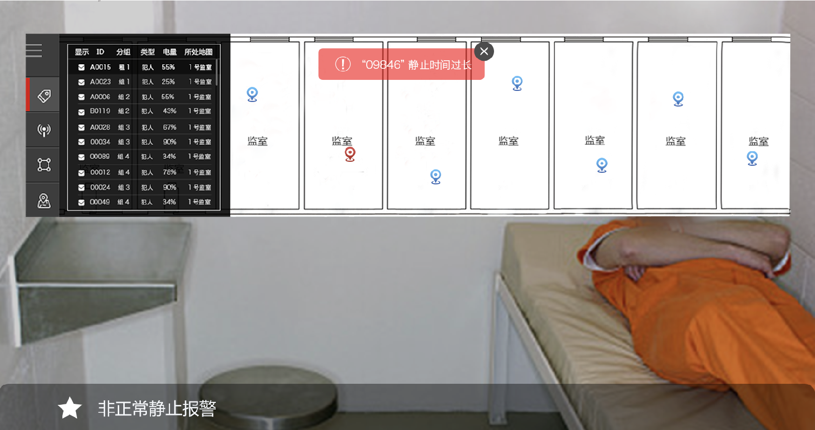 全跡科技監獄高精度定位管理系統使用UWB室內定位技術,通過在監所區域安裝定位基站,為犯人和獄警佩戴定位標簽的形式,實現人員精準實時定位。能夠隨時掌握人員在監所中的位置、活動軌跡以及監所各區域人員分布情況等,系統后臺可以設置禁區入侵、脫離監管報警等并有視頻聯動功能,便被動監管為主動監管。系統支持全天候動態點名,對犯人進行24小時位置監控和軌跡跟蹤,使監獄管理工作更加智能化。