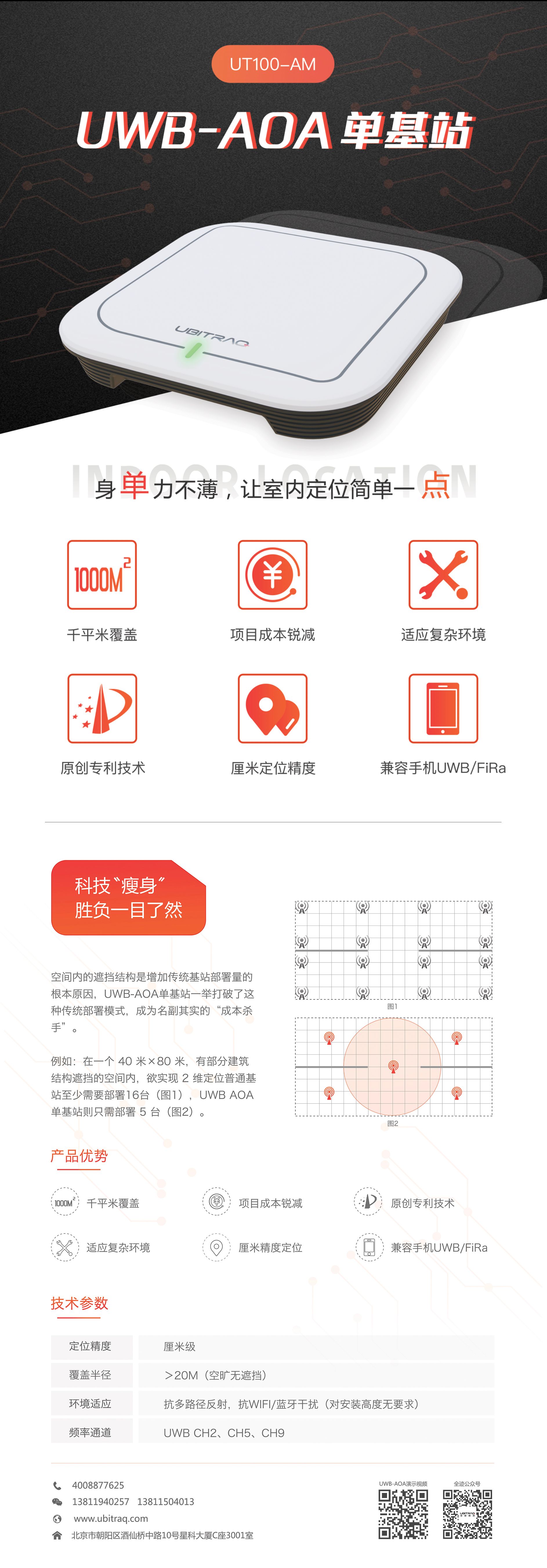 全跡科技正式發布基于UWB天線陣列的UWB AOA單基站定位產品演示視頻。辦公室面積1000平,用1臺新型UWB AOA基站即可完全覆蓋厘米級精度(包括每個房間),而傳統UWB TOF/TDOA方案至少需要7臺基站(并且不能覆蓋房間),藍牙5.1 AOA基站至少需要12臺(不包含房間,精度也更低),這是UWB定位技術的革新。在未來,高精度室內定位服務會像GPS和云服務一樣,成為每個人都觸手可得的基礎設施。全跡致力成為該行業的領導者。